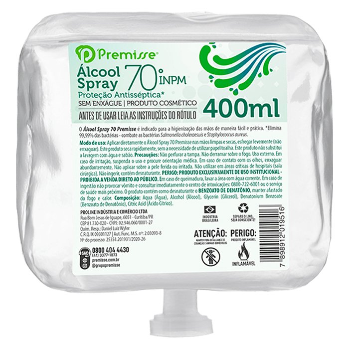 O Álcool Spray 70 Premisse é indicado para a higienização das mãos de maneira fácil e prática. Exclusivamente para o dispenser Premisse Compacto. Elimina* 99,99% das bacterias.
