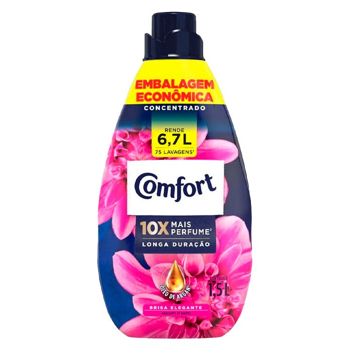 O Amaciante Concentrado Comfort Cuidado Essencial tem 10X mais perfume e faz sua roupa durar muito mais! Sua nova fórmula contém óleo de argan (um óleo natural com alto potencial nutritivo) que previne os danos da lavagem, mantendo as cores do tecido vibrantes por mais tempo e suas roupas muito perfumadas. O perfume de Comfort blinda o tecido contra o mau odor e deixa uma fragrância duradoura nas suas peças! Menos de meia tampinha de Comfort concentrado basta para lavar suas roupas. Os ingredientes do Amaciante Concentrado Comfort Cuidado Essencial são capazes de alinhar e proteger o tecido, reduzindo o atrito entre as fibras de suas roupas durante o processo de lavagem. O cuidado intensivo de Comfort funciona da mesma forma que um condicionador para cabelos: alinha os fios, mantém sua forma original e ajuda a controlar a quebra das fibras, reduzindo futuros danos nas peças. Com o amaciante Comfort suas roupas ficam livres de bolinhas, conservam a sua forma e cor, como se ela tivesse acabado de sair da loja. Comfort concentrado possui perfume encapsulado que penetra no tecido durante o processo de lavagem, deixando sua roupa muito mais cheirosa até mesmo depois de seca! O motivo? Quando você se movimenta essas cápsulas de perfume se rompem e liberam essa fragrância incrível, fazendo com que aquele cheirinho de roupa lavada dure muito mais!