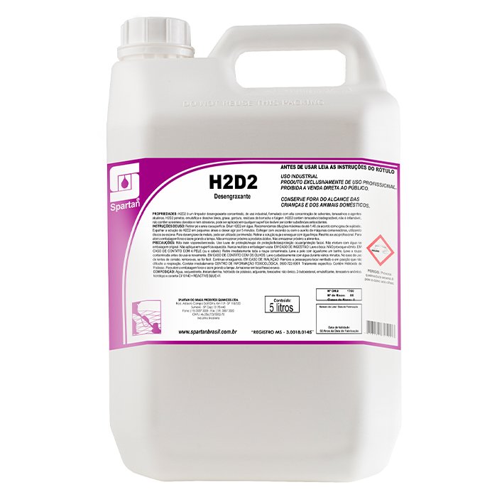 H2D2 é um limpador desengraxante concenrado, de uso industrial, formulado com alta concentração de solventes, tensoativos e agentes alcalinos. H2D2 penetra, emulsifica e dissolve óleos, graxa, gordura, resíduos de borracha e fuligem. H2D2 contém tensoativo biodegradável, não é inflamável, não contém solventes clorados e nem abrasivos, pode ser aplicado em qualquer superfície lavável por conter substâncias antioxidantes.
