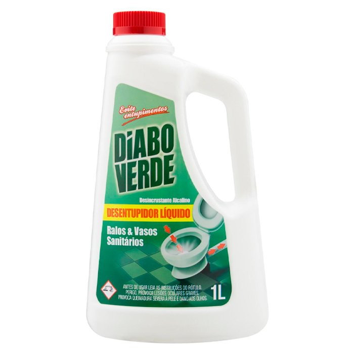 Diabo Verde líquido vence entupimentos causados por papel higiênico, absorventes sem o plástico, gorduras e resíduos alimentícios.