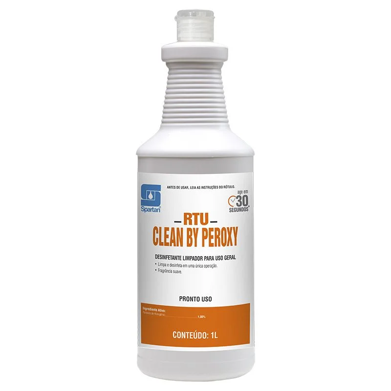 RTU Clean By Peroxy é um desinfetante limpador de uso geral que combina o poder do Peróxido de Hidrogênio com tensoativos, garantindo eficiência e praticidade da limpeza. O Peróxido de Hidrogênio age nas moléculas de gordura e oleosidade animal, vegetal e mineral, quebrando-as em partículas menores, tornando mais fácil a remoção da sujidade. Após cumprir sua função, o Peróxido de Hidrogênio se transforma em oxigênio e água, não deixando residual na superfície.
