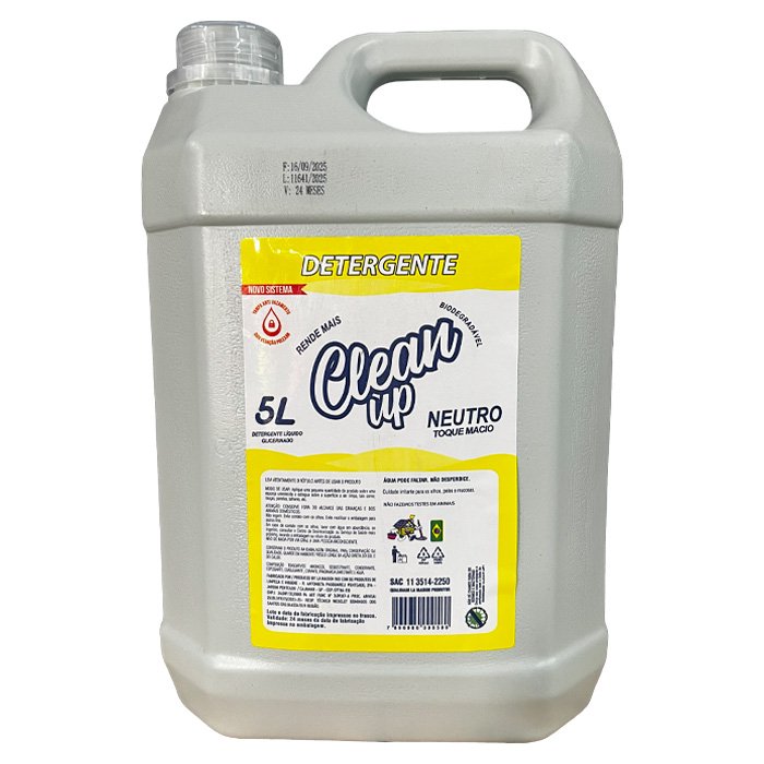 O DETERGENTE 5L NEUTRO CLEAN UP é um produto especialmente elaborado para limpeza de louças, talheres, utensílio, fogões, fornos, pisos e diversas superficies lavaveis. Tem ação sobre gorduras removendo todos os resíduos.