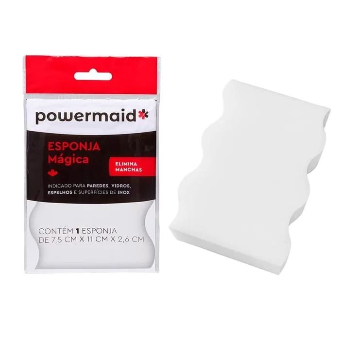 A Esponja Mágica Powermaid é a melhor opção para a limpeza no dia a dia. A esponja é um produto extremamente eficaz para remover manchas e sujeiras difíceis. Não solta pelos, remove manchas de giz de cera e lápis de cor, marcas de mãos, vidros e espelhos, cerâmicas, pisos, mesas de madeira, manchas de tênis e superfícies de inox. A esponja mágica de melamina consiste em uma esponja multiuso altamente condensada confeccionada para uso automotivo e doméstico. É a solução ideal para limpeza profunda do couro e sujeiras leves apenas com água.