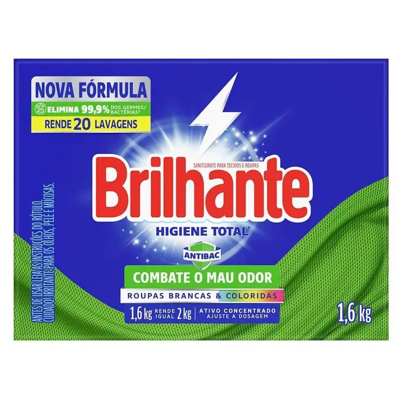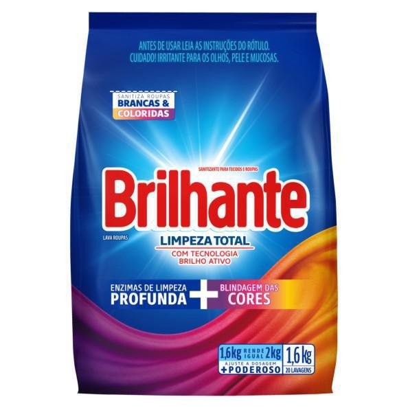 Um sabão em pó da marca Brilhante, com uma embalagem generosa de 1600g. Este sabão em pó é formulado para proporcionar limpeza total para suas roupas, removendo manchas e sujeira, enquanto mantém as cores vibrantes. É projetado para deixar suas roupas limpas e com aspecto renovado. É uma escolha prática e eficaz para a lavanderia, ajudando a manter suas roupas em ótimo estado. Com uma embalagem maior, é uma opção conveniente para uso prolongado.