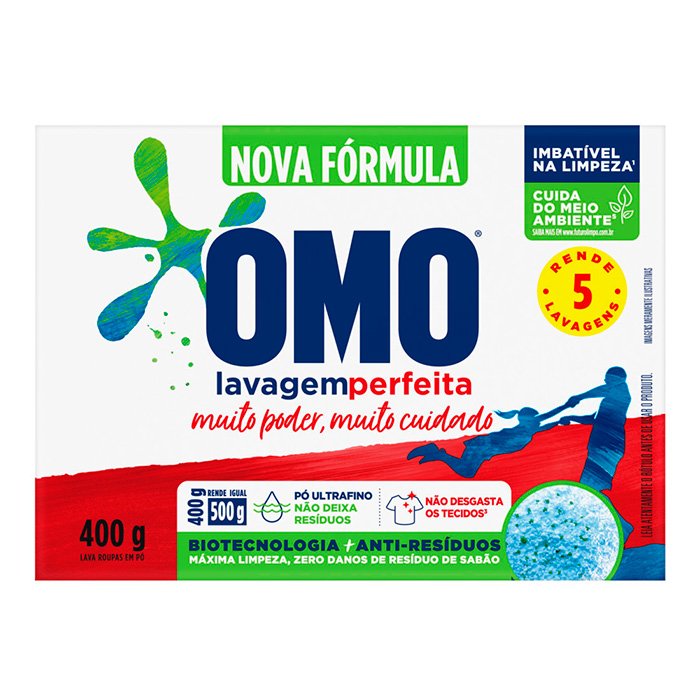 Um sabão em pó da marca Omo, com uma embalagem de 400g. Este sabão em pó é formulado para a lavagem eficaz de roupas, removendo manchas e sujeira, deixando as roupas limpas e frescas. Omo é uma marca amplamente reconhecida por sua eficácia na limpeza de roupas e é uma escolha popular para a lavanderia.