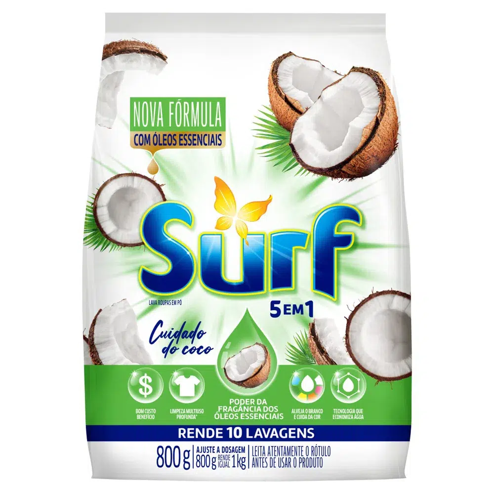 Um sabão em pó da marca Surf, com uma embalagem de 800g. Este sabão em pó é formulado com cuidado do coco e oferece uma ação 5 em 1, incluindo limpeza eficaz, remoção de manchas, cuidado com as cores, frescor duradouro e economia de energia. É projetado para a lavagem eficaz de roupas, deixando-as limpas, com cores vivas e um aroma agradável de coco. É uma escolha prática para a lavanderia.
