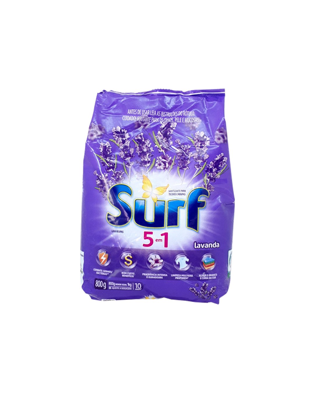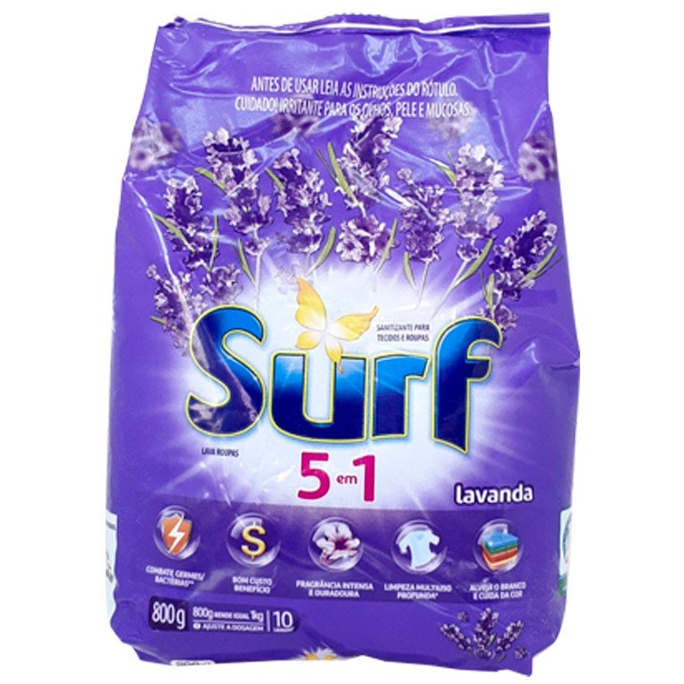 Um sabão em pó da marca Surf, com uma embalagem de 800g. Este sabão em pó oferece uma ação 5 em 1, incluindo limpeza eficaz, remoção de manchas, cuidado com as cores, frescor duradouro e economia de energia. Além disso, possui o aroma suave de lavanda, que deixa um perfume agradável nas roupas. É projetado para a lavagem eficaz de roupas, mantendo suas cores e deixando um aroma fresco. É uma escolha prática para a lavanderia.