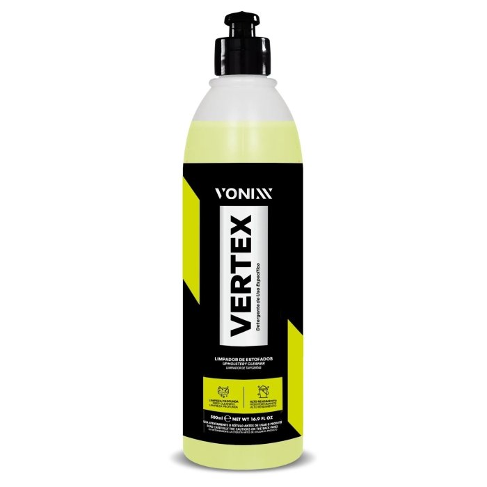 Vertex é um limpador de estofados automotivos e residenciais. O produto tem alta concentração de ativos a fim de aumentar o rendimento e limpar com eficiência. Observações importantes: Em caso de contato com cerâmica ou porcelanato, recomendamos enxaguar imediatamente para evitar possíveis manchas. O produto é alcalino e recomendamos o uso de óculos e luvas. Não recomendado para tecidos naturais como linho, seda, lã e demais tecidos naturais, pois poderá causar manchas. Em caso de limpeza de estofados automotivo, evitar respingar o produto em outras superfícies do veículo, tais como: couro, vidros, plásticos e demais superfícies internas do carro a fim de evitar manchas.
