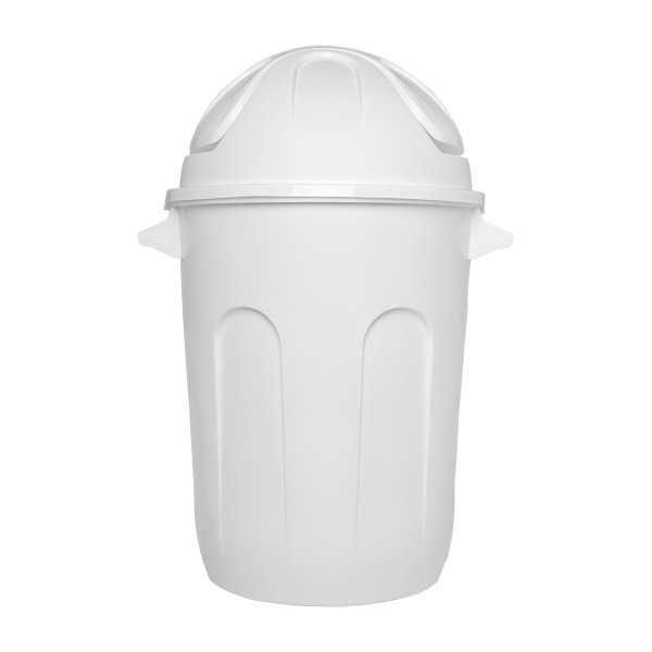 Lixeira 60L Redonda Branca Basculante Jaguar. Alta resistência e durabilidade. Pegador inferior que facilita o despejo do lixo. Alças reforçadas com pega anatômica. Tampa basculante com trava, evita o contato com o lixo. Não acumula água na tampa, ideal para área externa.