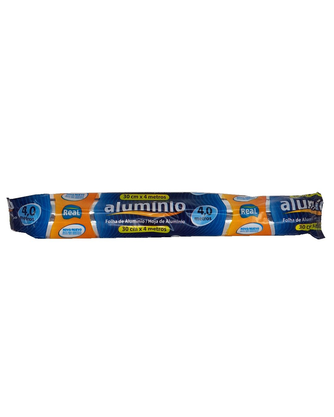Um rolo compacto de papel alumínio, com 30cm de largura e 4 metros de comprimento, conveniente para uso doméstico. Perfeito para embalar e armazenar alimentos com praticidade.