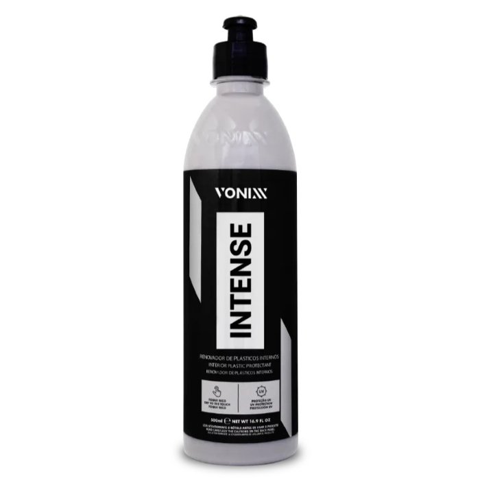Intense é um renovador de plástico com proteção UV, cuja fórmula balanceada promove acabamento natural e toque seco, com durabilidade de 6 meses. O produto deve ser utilizado especificamente na parte interna do automóvel, em superfícies como vinil e plástico em geral.