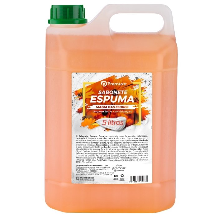 O Sabonete Espuma Magia das Flores 5L da Premisse é um produto formulado para limpeza suave de mãos e rosto, com aroma perfumado de flores amarelas e frutas amarelas. Ele proporciona uma espuma suave, limpa a pele sem agredi-la e é pronto para uso, não exigindo diluição. Sua aplicação é ideal para locais como hotéis, hospitais e restaurantes.