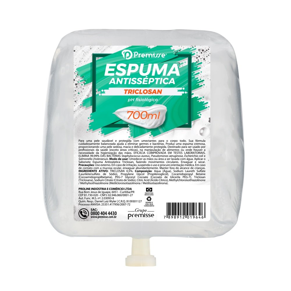 A Espuma Premisse Antisséptica Triclosan apresenta tecnologia e segurança para higienização por conter Triclosan, uma potente substância que atua sobre um amplo espectro de bactérias. É uma espuma cremosa que proporciona uma pele sedosa, macia e delicadamente protegida. Destinada a uso em cozinhas industriais, indústrias alimentícias, laboratórios, hospitais etc. Não utilizar em áreas críticas de hospitais.