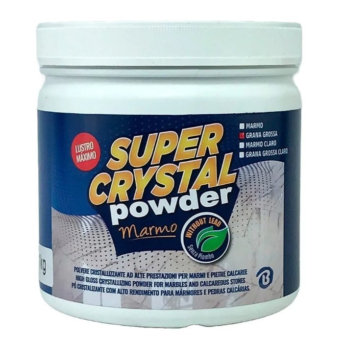 Produto em pó para polimento de mármores que age quimicamente com auxílio da enceradeira, eliminando riscos superficiais, fechando a porosidade da superfície, corrigindo pequenas imperfeições foscas. Ideal para restauração em pisos desgastados pela abrasão do tráfego. Pode ser utilizado antes da aplicação do Super Crystal Mármore.