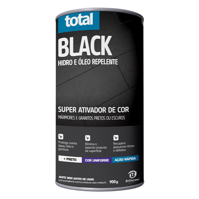 O super ativador de cor Total Black é um poderoso produto de cor preta com alta capacidade de penetração na superfície de mármores ou granitos pretos ou escuros. Ativa intensamente a cor do material, eliminando o aspecto “cinzento” ou “russo” através de uma profunda peetração de pigmentação preta que age rapidamente apenas com a aplicação feita com uma estopa. Proporciona escurecimento de cristais componentes de alguns materiais, dando mais uniformidade à sua cor natural. Protege contra água, óleo e gordura.